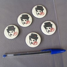 CINQÜENTA E QUATRO BÓTONS CIRCULARES (4 CM), EM METAL PRATEADO, COM FUNDO BRANCO. POSSUI A FIGURA DE CHARLIE CHAPLIN E A INSCRIÇÃO 'PT'.
