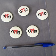 SETENTA BÓTONS CIRCULARES (4 CM), EM METAL PRATEADO, COM FUNDO BRANCO. POSSUI A INSCRIÇÃO 'OPTEI'.