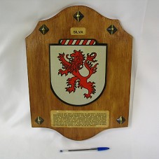BRASÃO DO SOBRENOME DA FAMÍLIA SILVA, FIXADO EM MADEIRA ENVERNIZADA. POSSUI INSCRITO O HISTÓRICO SOBRE A FAMÍLIA SILVA.
