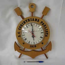 RELÓGIO DE PAREDE (42,5x25,5 CM) NO FORMATO DO DISTINTIVO DO S.C. CORINTHIANS PAULISTA, CONFECCIONADO EM MADEIRA. POSSUI A INSCRIÇÃO 'LUIZ INÁCIO LULA DA SILVA'.