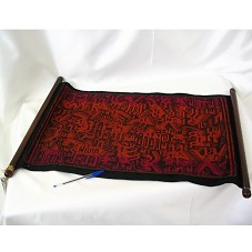 PAINEL EM TAPEÇARIA (64X37 CM), EM TONS DE ROSA, ALARANJADO E PRETO, COM DESENHOS GEOMÉTRICOS DE FIGURAS DE ANIMAIS. COSTURADO SOBRE BASE DE TECIDO PRETO (68X42 CM), PRESA A RIPAS DE MADEIRA NAS EXTREMIDADES, COM FIO DE NYLON NA PARTE SUPERIOR PARA COLOCAÇÃO EM PAREDE. ACOMPANHA ETIQUETA COM INFORMAÇÕES SOBRE A PEÇA E CARTÃO DE VISITA DO PRESIDENTE DE LA REPÚBLICA DE BOLIVIA / GONZALO SANCHEZ DE LOZADA.