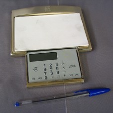 SUPORTE PARA BLOCO DE ANOTAÇÕES ( 1,5X10,5X14,5 CM) EM METAL DOURADO COM A LOGOMARCA DO PARTIDO SOCIALISTA FRANCÊS. ACOMPANHA UMA CALCULADORA (8,5X5,5 CM), ACOPLADA AO SUPORTE.