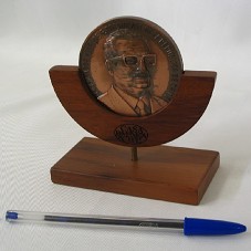 MEDALHA (7 CM), EM BRONZE. POSSUI NO ANVERSO A EFÍGIE DO EX-PRESIDENTE DO CHILE 'SALVADOR ALLENDE' E NO REVERSO FIGURAS HUMANAS COM UMA BANDEIRA ATRÁS E A INSCRIÇÃO 'DUEÑOS DE NUESTRO PROPIO DESTINO / 1970-1976'. ACONDICIONADA EM UM SUPORTE (8X5,5X11 CM) DE MADEIRA COM A INSCRIÇÃO 'CASA DE MONEDA DE CHILE'.
