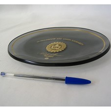 PRATO DECORATIVO OVALADO (15,5X21 CM) EM VIDRO ESCURECIDO, COM FRISO DOURADO. POSSUI NO CENTRO A LOGOMARCA E A ASSINATURA DO PRESIDENTE DA UAW E A INSCRIÇÃO 'IN FELLOWSHIP AND UNION SOLIDARITY'.