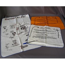DIPLOMA DA PAZ ESTAMPADO EM TECIDO BRANCO (62X41 CM), COM DIVERSAS LOGOMARCAS E DIZERES E UM PAPEL COLADO COM A INSCRIÇÃO 'OBS: SOMENTE APÓS A APROVAÇÃO DO EXCELENTÍSSIMO PRESIDENTE ELEITO LUIZ INÁCIO LULA DA SILVA, NESTE ESPAÇO VAZIO SERÁ ESTAMPADO O TÍTULO OFICIAL / PROJETO LULA NORDESTE / PLANTANDO UM SORRISO EM QUEM TEM SEDE DE VIVER'. ACOMPANHA DOIS TECIDOS, SENDO UM BRANCO (37,5X30,5 CM) E OUTRO ALARANJADO (43X29 CM), COM FRASES SOBRE VOTAR CONSCIENTE.