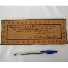 ARTESANATO EM COURO (23,5X9 CM) COM A INSCRIÇÃO 'LEMBRANÇA DE SANTA ROSA - RS / SÃO BORJA. / AO NOSSO FUTURO PRESIDENTE LULA, COM CARINHO DE SUAS ADMIRADORAS - FEVEREIRO DE 1994. / MIRELA E INAIANA'.