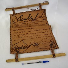 PAINEL EM COURO (38,5X29,5 CM), COM DESENHOS CAMPESTRES E A INSCRIÇÃO 'LULA / CADA PEDAÇO DE ESTRADA PERCORRIDA NESTE DOIS DIAS PEREGRINOS.....SEJA PORTANTO PARA TI A QUARTA COLÔNIA DE IMIGRAÇÃO ITALIANA DO RIO GRANDE DO SUL EXEMPLO DE TRIUNFO DOS QUE CRÊEM EM SEUS IDEAIS E TRABALHAM PARA ALCANÇA-LOS / FAXINAL DO SOTURNO / 21-05-1997'. PRESO A RIPAS DE MADEIRA NAS EXTREMIDADES.