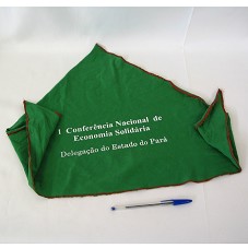 LENÇO EM MALHA VERDE, COM COSTURA VERMELHA. NA FRENTE, EM BRANCO, A INSCRIÇÃO 'I CONFERÊNCIA NACIONAL DE ECONOMIA SOLIDÁRIA / DELEGAÇÃO DO ESTADO DO PARÁ'.