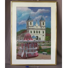 PINTURA (58X38 CM) SOBRE EUCATEX, RETRATANDO UMA PRAÇA, COM UMA IGREJA BARROCA AO FUNDO, E UM CORETO EM PRIMEIRO PLANO. NO CANTO INFERIOR DIREITO, ASSINATURA DO ARTISTA 'RAIMUNDO DIARAÚJO'. POSSUI MOLDURA EM ALUMÍNIO DOURADO E PASSE-PARTOUT BRANCO.