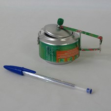 MINIATURA DE PANELA DE PRESSÃO (6,5X11X6,5 CM), CONFECCIONADA COM LATA DE ALUMÍNIO DE SUCO E REFRIGERANTE, COM ESTAMPA VERDE.