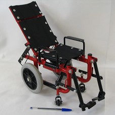 MODELO REDUZIDO DE CADEIRA DE RODAS (34X17X35 CM), COM ARMAÇÃO PINTADA DE VERMELHO E PRETO, E ASSENTO PRETO. POSSUI POSTURA DO ASSENTO REGULÁVEL. ACOMPANHA CARTÃO DE VISITA EM NOME DO REMETENTE.