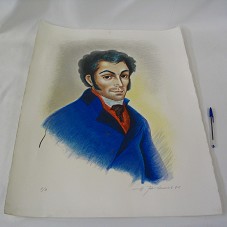 DESENHO (62X42 CM) EM PAPEL CANSON (77X57 CM), RETRATANDO SIMON BOLIVAR VESTIDO COM SOBRETUDO AZUL. NO CANTO INFERIOR DIREITO, ASSINATURA DO ARTISTA 'H JAIMESS 83'. NO ESQUERDO, A INSCRIÇÃO 'P/A'. ACOMPANHA FOLHETO COM INFORMAÇÕES SOBRE O ARTISTA.