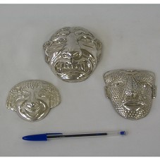TRÊS MINIATURAS DE MÁSCARAS, CONFECCIONADAS EM PRATA. A MENOR (8,5X8 CM) RETRATANDO UMA MULHER COM DIADEMA DE FOLHAS DE PARREIRA E UVAS. A INTERMEDIÁRIA (9,5X8 CM), DE FORMATO TRIANGULAR, RETRATA O ROSTO DE UM HOMEM, COM TEXTURA LEMBRANDO TIJOLOS. A MAIOR (12X9,5 CM) RETRATANDO UM HOMEM COM DOIS LAGARTOS NA CABEÇA. ACONDICIONADAS EM ESTOJO FORRADO DE VELUDO PRETO, COM FRISO DOURADO.