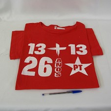 CAMISETA (TAM G) EM MALHA VERMELHA, DE MANGA CURTA. NA FRENTE, ESTAMPA EM BRANCO, COM A INSCRIÇÃO '13 + 13 / 26 ANOS PT'.