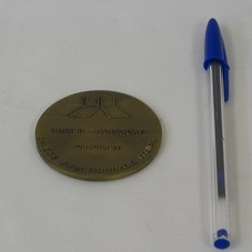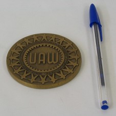 MEDALHA (75 MM) EM BRONZE. NO ANVERSO, A INSCRIÇÃO 'UAW / UNITED AUTOMOBILE, AEROSPACE AND AGRICULTURAL IMPLEMENT WORKERS OF AMERICA', E LOGOMARCA DA INSTITUIÇÃO (CÍRCULO FEITO COM VÁRIOS FIGURAS HUMANAS ESTILIZADAS, DE MÃOS DADAS). NO REVERSO, A INSCRIÇÃO 'WITH OUR HANDS WE BUILD AUTOMOBILES, AEROSPACE VEHICLES, AND AGRICULTURAL IMPLEMENTS. WITH OUR HEARTS, A BETTER TOMORROW. IN FELLOWSHIP AND UNION SOLIDARITY'. ACONDICIONADA EM CAIXA DE PAPELÃO AZUL, SEM TAMPA.