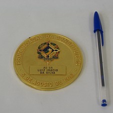 MEDALHA (89 MM) EM METAL DOURADO. NO ANVERSO, A INSCRIÇÃO 'PROMULGAÇÃO DA CONSTITUIÇÃO / 6 DE AGOSTO DE 1983 / AO SR. LUIZ INÁCIO LULA DA SILVA', TENDO AO CENTRO O DESENHO DO BRASÃO DO ESTADO DE RONDÔNIA, COM A INSCRIÇÃO '1943 1981 RONDÔNIA'. NO REVERSO, NO CENTRO, NOMES DE VÁRIOS POLÍTICOS; E, AO REDOR, A INSCRIÇÃO 'ESTADO DE RONDÔNIA / INSTALAÇÃO DA ASSEMBLÉIA CONSTITUINTE'. ACONDICIONADA EM ESTOJO FORRADO DE VELUDO AZUL MARINHO.
