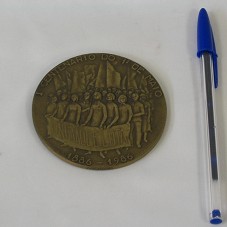 MEDALHA (80 MM) EM BRONZE. NO ANVERSO, FIGURA DE VÁRIAS MULHERES E HOMENS SEGURANDO BANDEIRAS E FAIXA COM A INSCRIÇÃO 'UNIDADE E LUTA'. AO REDOR, 'I CENTENÁRIO DO 1º DE MAIO / 1886-1986'; E, EM LETRA MENOR, PRÓXIMA À BORDA, 'VASCO DA CONCEIÇÃO'. NO REVERSO, ROSTO DE UM HOMEM E DE UMA MULHER E A INSCRIÇÃO '100 ANOS DE LUTA / PELO PÃO / PELO TRABALHO / PELA DEMOCRACIA / PELA PAZ'. POSSUI BORDA LISA E A NUMERAÇÃO '893/1000' GRAVADA NELA.