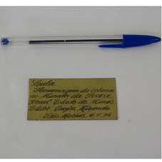 PLACA (4,3X7,9 CM) EM METAL DOURADO, COM A INSCRIÇÃO 'LULA, HOMENAGEM DA COLUNA NO MUNDO DA PESCA / JORNAL ESTADO DE MINAS / EDITOR ONOFRE MIRANDA / TRÊS MARIAS, 6-9-94'. ATRÁS, RESQUÍCIOS DE COLA, COMO SE A PLACA ESTIVESSE COLADA EM ALGUM OUTRO OBJETO.