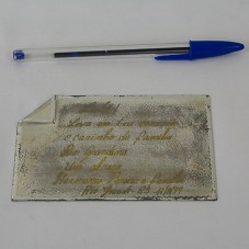 PLACA (8X12 CM) EM PRATA JATEADA, COM BORDAS POLIDAS E UMA DAS PONTAS DOBRADA. POSSUI A INSCRIÇÃO, EM DOURADO, LULA / LEVA EM TEU CORAÇÃO O CARINHO DA FAMÍLIA RIO GRANDINA / UM ABRAÇO, HERMANIO PEREIRA E FAMILIA / RIO GRANDE-RS / 11/8/94'. ACONDICIONADA EM ESTOJO FORRADO DE LYCRA AZUL.