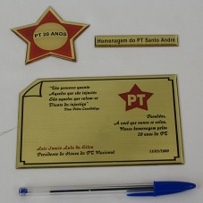 PLACA (9,5X14,5 CM) EM METAL DOURADO, COM UMA DAS PONTAS RECORTADAS. POSSUI INSCRITO, UM VERSO DE 'DOM PEDRO CASALDÁLIGA', E A INSCRIÇÃO 'PARABÉNS, A VOCÊ QUE NUNCA SE CALOU, NOSSA HOMENAGEM PELOS 20 ANOS DO PT / LUIS INACIO LULA DA SILVA / PRESIDENTE DE HONRA DO PT NACIONAL / 13/05/2000'. ACOMPANHA UMA ESTRELA EM MESMO MATERIAL, PINTADA DE VERMELHO E COM A INSCRIÇÃO 'PT 20 ANOS'; E UMA PLACA MENOR, 'HOMENAGEM DO PT DE SANTO ANDRÉ'. ACONDICIONADA EM ESTOJO FORRADO DE VELUDO VERMELHO.