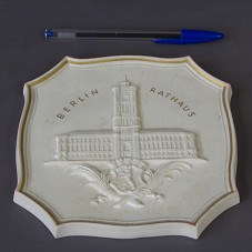 PLACA (17X16,5 CM) EM CERÂMICA BRANCA, COM BORDAS TRABALHADAS E PINTADAS EM DOURADO. NO CENTRO, EM ALTO RELEVO, FACHADA DA PREFEITURA DE BERLIM, COM UM BRASÃO ABAIXO DELA, E A INSCRIÇÃO 'BERLIN RATHAUS'. ATRÁS, A INSCRIÇÃO 'BERLIN HAUPTSTADT DER DEUTSCHEN DEMOKRATISCHEN REPUBLIK'. ACONDICIONADA EM ESTOJO FORRADO DE TECIDO CINZA COM BRASÃO NA TAMPA.