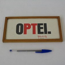 QUADRO (11,7X22,2 CM) COM MOLDURA EM MADEIRA CLARA. EMOLDURA PAPEL COM A INSCRIÇÃO 'OPTEI.', COM O 'P' E 'T' EM VERMELHO, ASSINADO POR 'CARLITO MAIA'.