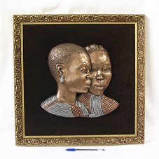 ESCULTURA (29X31 CM) DE PAREDE, EM METAL, RETRATANDO DUAS FACES UNIDAS, DE MULHERES NEGRAS, COM COLARES TÍPICOS. PINTADAS EM TOM DE MARROM-DOURADO, E COLARES EM PRATA. EM UM DOS COLARES, A INSCRIÇÃO 'TOB NEE-OWOO'. FIXADA EM BASE DE MADEIRA COBERTA POR VELUDO MARROM E COM MOLDURA EM MADEIRA TRABALHADA E PINTADA EM DOURADO. ATRÁS, PAPEL COM A INSCRIÇÃO 'TWO HEADS ARE BETTER THAN ONE'.