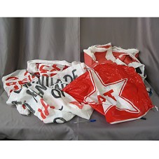 UMA BANDEIRA PLÁSTICA VERMELHA, COM ESTRELA DO PT, E TRÊS FAIXAS. NA PRIMEIRA (284X77 CM), A INSCRIÇÃO 'TODO APOIO À LUTA PELA REINTEGRAÇÃO DOS TRABALHADORES PORTUÁRIOS AVULSOS EM SUAPE'. A SEGUNDA (286X69 CM) EM TNT BRANCO, COM A INSCRIÇÃO 'URGENTE / A COMUNIDADE 21 DE ABRIL VÁRZEA ESTÁ ABANDONADA E DESPREZADA COM 800 FAMÍLIAS ÓRFÃS PRESTES A SOFREREM AÇÃO DE DESPEJO'. E A TERCEIRA (456X77 CM), EM TECIDO BRANCO, COM A INSCRIÇÃO 'URGENTE / PORTUÁRIOS AVULSOS DE SUAPE CLAMAM PELA REINTEGRAÇÃO EM SEUS POSTOS DE TRABALHO'.