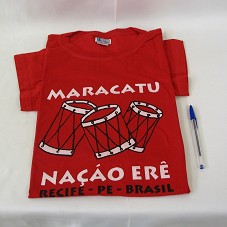 CAMISETA (TAM M) EM MALHA VERMELHA, DE MANGA CURTA. NA FRENTE, EM BRANCO, 'MARACATU / NAÇÃO ERÊ / RECIFE-PE-BRASIL', E DESENHO DE TRÊS INSTRUMENTOS MUSICAIS.