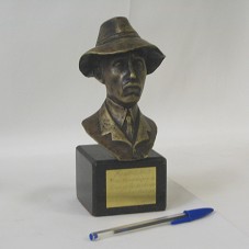 ESCULTURA (16X8X9 CM) EM BRONZE, RETRATANDO O BUSTO DE SANTOS DUMONT, PAI DA AVIAÇÃO. FIXADA EM BASE DE MÁRMORE PRETO (8X8X6 CM), COM PLACA METÁLICA DOURADA NA FRENTE, CONTENDO A INSCRIÇÃO 'PRESIDENTE LULA: UMA HOMENAGEM DA TERRA DO PAI DA AVIAÇÃO / PREFEITURA MUNICIPAL DE SANTOS DUMONT - MG / 26/07/06'.