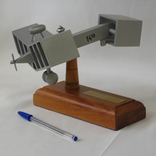 ESCULTURA (22X19X9 CM) EM MADEIRA PINTADA DE PRATEADA, MODELO REDUZIDO DO AEROPLANO '14 BIS'. FIXADO EM SUPORTE COLADO EM BASE DE MADEIRA (18,5X7,5X9 CM). NA BASE, PLACA METÁLICA DOURADA CONTENDO A INSCRIÇÃO 'PRESIDENTE LULA: LEMBRANÇA DO CENTENÁRIO VÔO DO 14 BIS / PREFEITURA MUN. SANTOS DUMONT - MG / 26/07/06'.