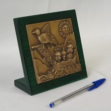 ESCULTURA BIDIMENSIONAL (10,5X10,5 CM) EM BRONZE, RETRATANDO UMA CARAVELA COM TRÊS MARINHEIROS E UMA AVE. NO CANTO INFERIOR ESQUERDO, ASSINATURA DO ARTISTA E O NÚMERO '67/100'. ATRÁS, LOGOMARCA DA 'REGIONE MARCHE', DESENHO DA LETRA 'M' E DE UM PÁSSARO ESTILIZADO. FIXADA/INCRUSTADA EM BASE DE MADEIRA (13,5X13,5X5 CM) PINTADA DE VERDE. ACONDICIONADA EM CAIXA FORRADA DE VELUDO AZUL.