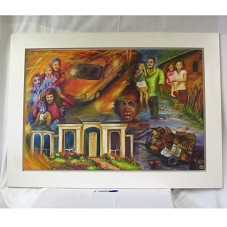 PINTURA SOBRE TELA (80X117 CM), USANDO TÉCNICA DE SOBREPOSIÇÃO DE IMAGENS, MOSTRANDO A REALIDADE DE DUAS FAMÍLIAS, UMA RICA E OUTRA POBRE. NO CANTO INFERIOR DIREITO, ASSINATURA DA ARTISTA, 'MARTA NETTO 2004'. ATRÁS, A INSCRIÇÃO 'ARTISTA: MARTA NETTO / COLETÂNEA: CONSTRANGENDO COM O CONTRASTE / TÉCNICA: SOBRE-POSIÇÃO DE IMAGENS / MATERIAL: ACRÍLICO S/ TELA / CONTATO: (48) 3228-2897 8428-6421'. FIXADO EM MOLDURA (103X141 CM) DE MADEIRA PINTADA DE BRANCO.