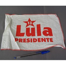 BANDEIRA (21X30 CM) EM TECIDO BRANCO. POSSUI A ESTRELA DO PT E A INSCRIÇÃO 'LULA PRESIDENTE'.