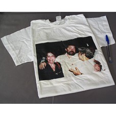 CAMISETA (TAM P) EM MALHA BRANCA, DE MANGA CURTA. NA FRENTE, ESTAMPA COM FOTOGRAFIA DO PRESIDENTE LULA COM DUAS SENHORAS.