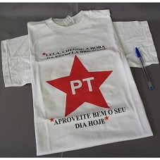 DUAS CAMISETAS IGUAIS (TAM G) EM MALHA BRANCA, DE MANGA CURTA. NA FRENTE E ATRÁS, ESTAMPA COM DESENHO DA ESTRELA DO PARTIDO DOS TRABALHADORES E A INSCRIÇÃO 'LULA, CHEGOU A HORA DA ESTRELA BRILHAR / APROVEITE BEM O SEU DIA HOJE'.