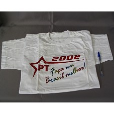 CAMISETA (TAM GG) EM MALHA BRANCA, DE MANGA CURTA. NA FRENTE, ESTAMPA COLORIDA COM A INSCRIÇÃO 'PT 2002 / FAÇA UM BRASIL MELHOR!'