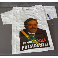 CAMISETA (TAM G) EM MALHA BRANCA, DE MANGA CURTA. NA FRENTE, A ESTAMPA DO PRESIDENTE LULA COM A FAIXA PRESIDENCIAL E A INSCRIÇÃO 'EU QUERO LULA PRESDIENTE!', ATRÁS 'EU QUERO LULA PRESIDENTE! / EU QUERO UM PAÍS MAIS JUSTO! / EU QUERO TRABALHAR, SER GENTE! / EU QUERO TER SAÚDE URGENTE! / EU QUERO ESTUDAR DECENTEMENTE! / TER DE VOLTA A PAZ, A LIBERDADE / PARA PODER OLHAR DE FRENTE, / DE CABEÇA ERGUIDA, SEM MEDO / E GRITAR, COM CIDADANIA, BEM FORTE! / EU SOU BRASILEIRO!'.