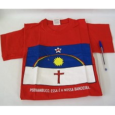 CAMISETA (TAM P) EM MALHA VERMELHA, DE MANGA CURTA. NA FRENTE, ESTAMPA DA BANDEIRA DO ESTADO DE PERNAMBUCO, COM A ESTRELA DO PT E A INSCRIÇÃO 'PERNAMBUCO. ESSA É A NOSSA BANDEIRA'. ATRÁS, A ESTRELA DO PT E A INSCRIÇÃO 'PERNAMBUCO. ESSA É A NOSSA BANDEIRA'.