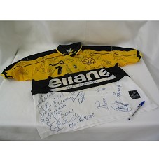 CAMISA DE FUTEBOL OFICIAL (TAM G), DO CRICIÚMA E.C., DE NÚMERO '7'. POSSUI A ASSINATURA DOS JOGADORES, COM MENSAGENS DE APOIO.