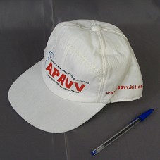 BONÉ EM BRIM BRANCO. NA FRENTE, ESTAMPA EM VERMELHO E PRETO, COM A INSCRIÇÃO 'APAVV / ASSOCIAÇÃO DE PARENTES E AMIGOS DE VÍTIMAS DE VIOLÊNCIA / EM DEFESA DAS VÍTIMAS E DOS DIREITOS HUMANOS', E DESENHO DE UMA POMBA. NAS LATERAIS, 'WWW.APAVV.KIT.NET'.