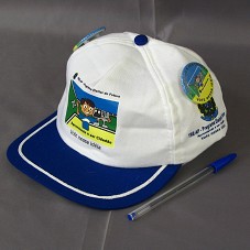 BONÉ EM BRIM BRANCO, COM ABA AZUL. NA FRENTE, ESTAMPA COM DESENHO DE UMA CRIANÇA ABRAÇANDO A URNA ELETRÔNICA, E A INSCRIÇÃO 'TRE-AP - PROGRAMA ELEITOR DO FUTURO / APRENDENDO A SER CIDADÃO / VOTE NESSA IDÉIA'. NAS LATERAIS, BRASÃO DA REPÚBLICA E MESMA INSCRIÇÃO. ACOMPANHA DOIS BÓTONS COM MESMA ESTAMPA.