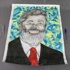 DESENHO (66X50 CM) EM CARTOLINA BRANCA, RETRATANDO O PRESIDENTE LULA DE TERNO PRETO E GRAVATA VERMELHA. FUNDO EM DESENHOS GEOMÉTRICOS NAS CORES VERDE, AMARELO E AZUL. NA PARTE SUPERIOR, A ASSINATURA 'MARCELO'. ATRÁS, NOME E ENDEREÇO DO AGENTE.