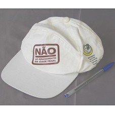 BONÉ EM TECIDO BRANCO. NA FRENTE, ESTAMPA EM MARROM, COM A INSCRIÇÃO 'NÃO AO REBAIXAMENTO DA IDADE PENAL'. NAS LATERAIS, '6º ENCONTRO DO MOVIMENTO NACIONAL DOS MENINOS E MENINAS DE RUA' E A LOGOMARCA DO MOVIMENTO.
