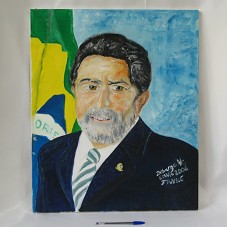 PINTURA SOBRE TELA (65X54 CM) RETRATANDO O BUSTO DO PRESIDENTE LULA, TENDO DO LADO ESQUERDO A BANDEIRA DO BRASIL. NO CANTO INFERIOR DIREITO, A ASSINATURA 'DEBARGE AA / ESSARS 2006 / FRANCE'. ATRÁS, FOTOGRAFIA DO AUTOR E A INSCRIÇÃO 'VIVE LULA DA SILVA' E OUTRAS.