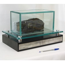 AMOSTRA DE SILTITO CARBONOSO, RETIRADA DA CAMADA DE CARVÃO BARRO BRANCO DA MINA MOROZINI (SS), NO MUNICÍPIO DE TREVISO EM SANTA CATARINA. POSSUI NA PARTE FRONTAL DESENHO EM AMARELO COM BRILHO METÁLICO, FORMANDO AS LETRAS 'PT'. DESENHO FORMADO NATURALMENTE PELA CONCENTRAÇÃO DE SULFETO DE FERRO (PIRITA) EM FRATURA DA ROCHA CARBONOSA. ACONDICIONADA EM REDOMA DE VIDRO, FIXADA EM BASE DE MADEIRA LAQUEADA DE PRETO, ONDE HÁ PLACA METÁLICA COM A INSCRIÇÃO 'A DESCOBERTA DO CARVÃO SE DEU A CERCA DE 200 MILHÕES DE ANOS ATRÁS NO PERÍODO CONHECIDO COMO PERMIANO. A NATUREZA, JÁ NESTA ÉPOCA, BUSCAVA EXPRESSAR A NECESSIDADE DO PT EXISTIR, COMO MOSTRA ESTA ROCHA ENCONTRADA NOS SUBSOLOS DE CRICIÚMA ... . ESTA ROCHA, QUE REPRESENTA UMA DAS RIQUEZAS DO NOSSO PAÍS, É ENTREGUE AO PRESIDENTE LUÍS INÁCIO LULA DA SILVA, COMO PROVA DE RECONHECIMENTO. / ARNOLDO MATTOS / ... / CRICIÚMA, 09 DE SETEMBRO DE 2006'. NA PARTE INTERNA DA REDOMA, CERTIFICADO DE AUTENTICIDADE DO PRODUTO.