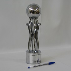 TROFÉU (28,5X7,5X7,5 CM) EM ALUMÍNIO USINADO, POLIDO E CROMADO, EM COMEMORAÇÃO AOS OITO OBJETIVOS DO MILÊNIO. NA PARTE INFERIOR DA BASE, DESCRIÇÃO DO OBJETO: 'TROFÉU PRÊMIO ODM BRASIL / ... / A COMPOSIÇÃO EXPRESSA QUE A SUSTENTABILIDADE DA TERRA DEPENDE DA ATITUDE DO SER HUMANO, E QUE ESTA ATITUDE POSSUI LEVEZA, EQUILÍBRIO, FIRMEZA E COESÃO. / UMA GRANDE ESFERA NO TOPO REPRESENTA O PLANETA. / OITO HASTES ESBELTAS E CURVAS, REPRESENTANDO PESSOAS, SUSTENTAM E ELEVAM-NO. SÃO EM NÚMERO DE OITO, POIS OITO SÃO OS OBJETIVOS. / A REPETIÇÃO DA HASTE REPRESENTA A IGUALDADE ENTRE OS POVOS E O FATO DE ESTAREM EM CÍRCULO, A UNIÃO EM PROL DESTA SUSTENTABILIDADE. / AS ESFERAS MENORES COMPÕEM COM A MAIOR, DESTACANDO E VALORIZANDO-A. SÃO AS CABEÇAS DOS HOMENS QUE FORMAM UMA CORRENTE AO REDOR DA TERRA COM UMA IDÉIA COESA: TRANSFORMÁ-LA EM UM LUGAR MELHOR. / ...'.