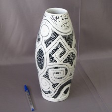 VASO DECORATIVO (29X12 CM), EM CERÂMICA, PINTADO EM BRANCO, COM DETALHES GEOMÉTRICOS EM PRETO. POSSUI BOJO MAIS ABAULADO QUE BASE E BOCA.