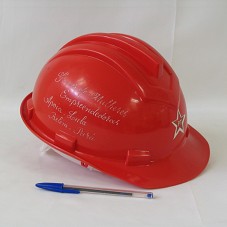 CAPACETE DE OBRA, NA COR VERMELHA. NA FRENTE, ADESIVO COM A ESTRELA DO 'PT'. E, EM UMA DAS LATERAIS, A INSCRIÇÃO 'GRUPOS DE MULHERES EMPREENDEDORAS APOIA LULA / BELÉM-PARÁ'.