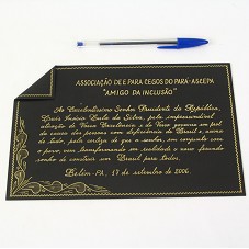 PLACA (24X16 CM) EM METAL PRETO, COM INSCRIÇÃO EM DOURADO 'ASSOCIAÇÃO DE E PARA CEGOS DO PARÁ-ASCEPA / AMIGO DA INCLUSÃO / AO EXCELENTÍSSIMO SENHOR PRESIDENTE DA REPÚBLICA, LUIS INÁCIO LULA DA SILVA, PELA IMPRESCINDÍVEL ATUAÇÃO DE VOSSA EXCELÊNCIA E DO VOSSO GOVERNO EM PROL DA CAUSA DAS PESSOAS COM DEFICIÊNCIA DO BRASIL E, ..., PELA CERTEZA DE QUE O SENHOR, EM CONJUNTO COM O POVO, VEM TRANSFORMANDO EM REALIDADE O NOSSO FECUNDO SONHO DE CONSTRUIR UM BRASIL PARA TODOS. BELÉM - PA, 17 DE SETEMBRO DE 2006'. ACONDICIONADA EM ESTOJO FORRADO DE LYCRA AZUL.